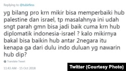 Pemilik akun @sadboi yang setuju jika hubungan diplomatik antara Indonesia dan Israel dibuka menyebut bahwa Indonesia bisa diuntungkan karena kerjasama “militer dan cyber security” dengan Israel.