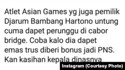 “Untung cuma dapet perunggu… Coba kalau dia dapet emas terus diberi bonus jadi PNS. Kan kasihan kepala dinasnya”.