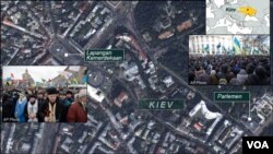 Pada hari Senin (2/12), ratusan demonstran menghambat pintu masuk ke gedung Kabinet dan bank sentral di Kiev. Sehari sebelumnya lebih dari 100 ribu demonstran berpawai melalui ibukota, dengan sekitar 200 orang cedera setelah sebagian demonstran berusaha menyerbu sebuah gedung pemerintah. Polisi menanggapi dengan gas air mata dan granat kejut.