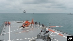 Tim-tim pencarian Indonesia mengangkut balon-balon pengangkat ke dalam helikopter Jumat sebelum operasi untuk mengangkat ekor tersebut.