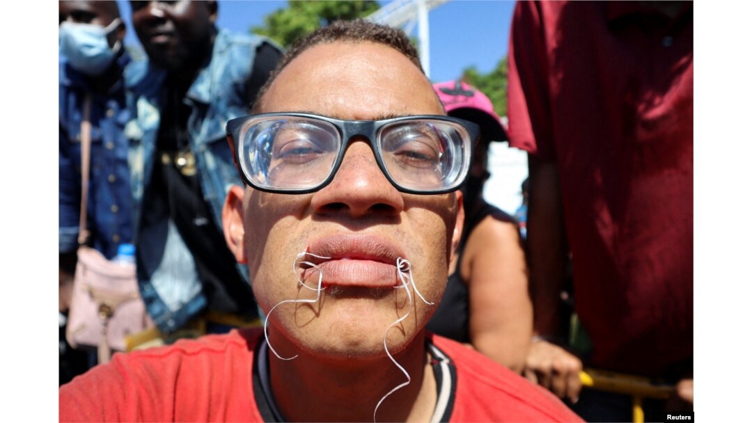 Seorang migran memulai mogok makan dengan menjahit mulutnya dalam aksi protes di luar kantor Institut Migrasi Nasional (INM) di Tapachula, Meksiko 15 Februari 2022. (REUTERS/Jose Torres)