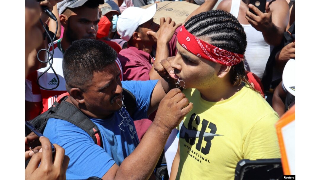 Seorang migran memulai mogok makan dengan menjahit mulut mereka dalam aksi protes di luar kantor Institut Migrasi Nasional (INM) di Tapachula, Meksiko 15 Februari 2022. (REUTERS/Jose Torres)